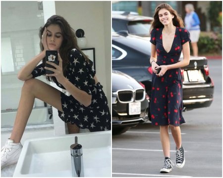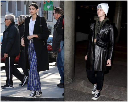 Если в 2018 году у тебя все еще есть хоть какие-то сомнения — носить ли платья с кроссовками и кедами, то мы даже не знаем, что еще предпринять. Посмотри на Кайю Гербер в платьях бренда Realisation par и классических кедах Converse и скажи, что это не красиво. В повседневной жизни Гербер практически не носит каблуки, а вот кеды, кроссовки и обувь в мужском стиле сочетает буквально со всем.