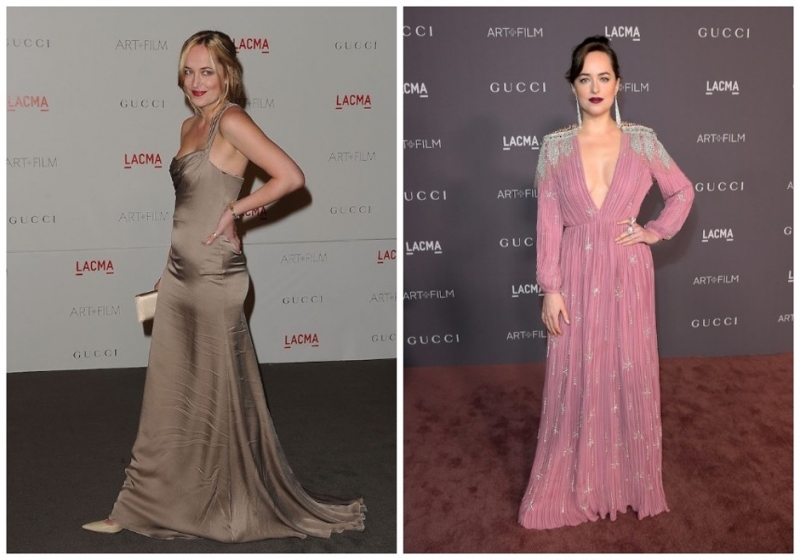 Слева 2011 год. Справа 2017 годВ юности Дакоту было невозможно увидеть в цветном образе: всем ярким платьям она предпочитала простые — черные, белые или нюдовые. И если на красной дорожке ее изредка можно было увидеть в цветочных Michael Kors и Marni, то в обычной жизни — никогда. «Я люблю, когда моя одежда отражает мое настроение», — рассказывает Джонсон. Рокерские футболки, джинсовки, солнцезащитные очки и байкерские ботинки — вот ее обычный casual до недавних пор. В прошлом году все изменилось: актриса заключила контракт с Gucci, стала лицом парфюма и на все светские мероприятия неизменно стала надевать жизнерадостные, усеянные пайетками и глиттером яркие наряды Алессандро Микеле.