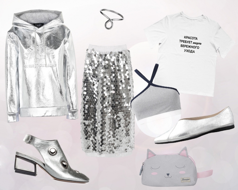 Толстовка Karl Lagerfeld (yoox.com); туфли Premiata; кольцо Wanna?Be!; юбка SIAMMSIAMM; футболка Colgate X Alexandr Rogov; топ Etam; обвь Vagabond; косметичка Samsonite.