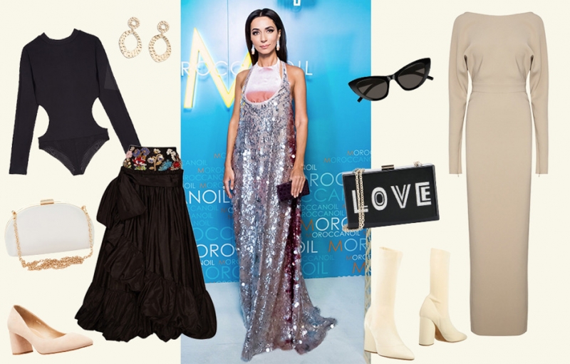 Кимоно H&M; комбинезон Motivi; очки MANGO; тени Kiko Milano; серьги MANGO; сумка Burberry; ботильоны Valentino Garavani (Yoox.com); брошь Wanna?Be!Перейдем к новой жертве — певице Заре в слюнявчике и платье в крупных пайетках. Может, она надела его, когда наносила макияж, чтобы тени и пудра не рассыпались и не испачкали декольте? Или когда ела пасту с томатным соусом, которой вполне можно было перепачкаться. В общем, эту странную манишку нужно срочно снять, ну а вместе с этим и пофантазировать над новым платьем.