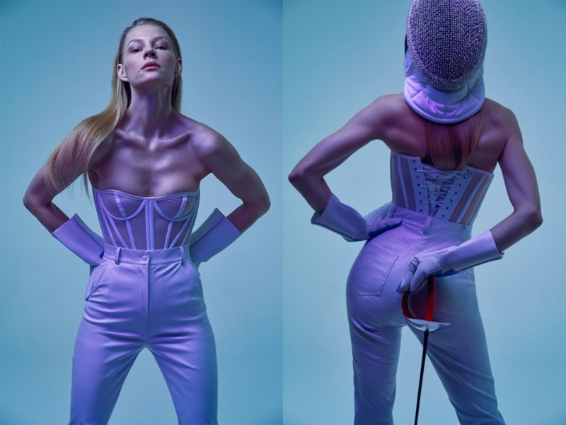 «Мы взяли белый цвет за основу, так как это фирменный цвет фехтовальщиков. Попросили российских дизайнеров Марину Гетман и Сергея Полякова придумать маски, вдохновившись фехтовальной темой, и постарались максимально показать невероятно спортивное и красивое тело Светы. У нее одни из самых красивых рук и спина, которые я видела», – рассказывает о съемке директор моды Vogue Ольга Дунина.