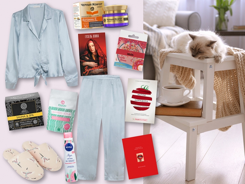 Пижама Oysho; тапочки Etam; зеркало для макияжа De.Co; масло для ног Natura Siberica; соляной скраб Enjoli; ночной крем для лица «Черный жемчуг»; мусс для тела Nivea.Весна пришла, но погода пока не очень, да и вирусы не спят. Так что почему бы не провести выходные дома?