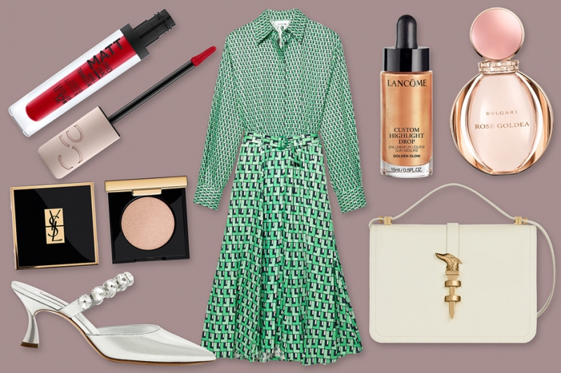 Платье Lacoste, сабо Casadei, сумка Trussardi, жидкий хайлайтер, Lancome, тени, Yves Saint Laurent, парфюм Rose Goldea, Bvlgari, помада, Catrice.Вечера августа предлагаем проводить не дома: тем более что погода и расписание мероприятий только на это и намекают. Главное, не забудь перчатки и маску!
