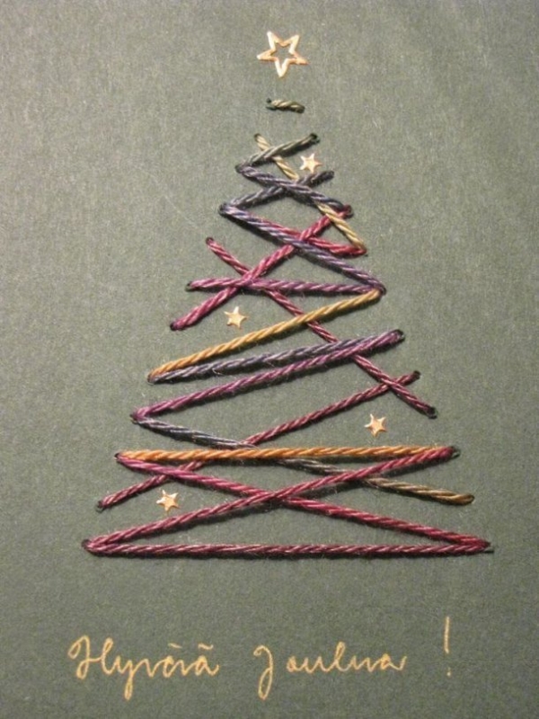 На листе картона нарисуйте необходимый контур, и прошейте его яркими нитками в хаотичном порядке. Получится простая, но очень нарядная открытка на Новый год. Идеи можно черпать в нашей статье "Новогодняя вышивка".