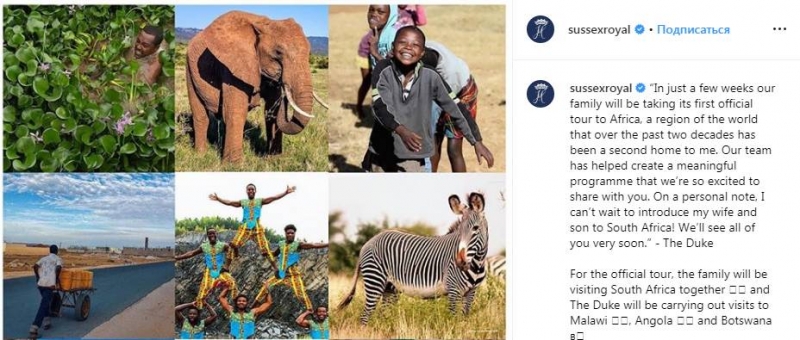 Всего через несколько недель наша семья отправится в первый официальный тур в Африку, регион, который за последние два года стал для меня вторым домом. Наша команда подготовила значительную программу, которой нам не терпится с вами поделиться. Лично я не могу дождаться момента, когда смогу представить своих жену и сына Южной Африке! Очень скоро увидимся. Герцог.