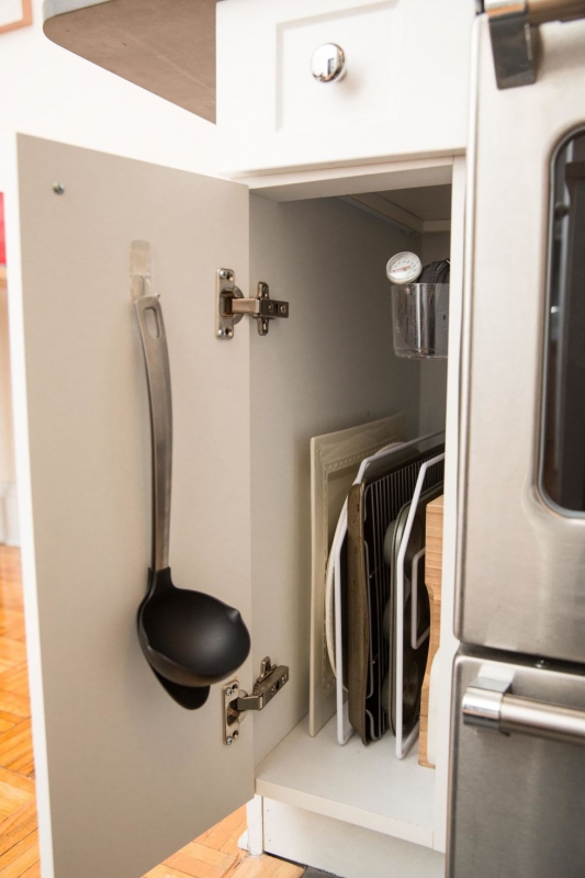 Используйте место на кухне по максимуму. И двери шкафов тоже, ведь на них можно разместить достаточно кухонной утвари.