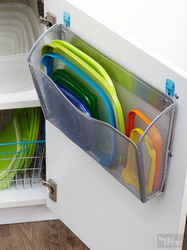 Крышки от кастрюль держите на дополнительных крепежах вертикально в шкафчике, чтобы они не занимали место на полке.