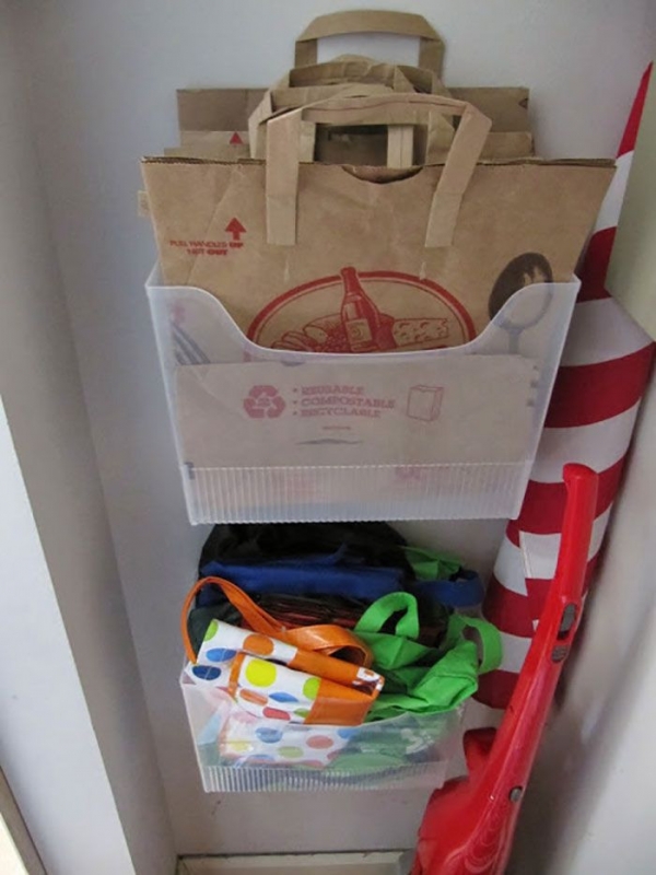 Подобные вертикальные подставки помогут в хранении пакетов и хозяйственных сумок, с которыми вы обычно ходите за покупками.