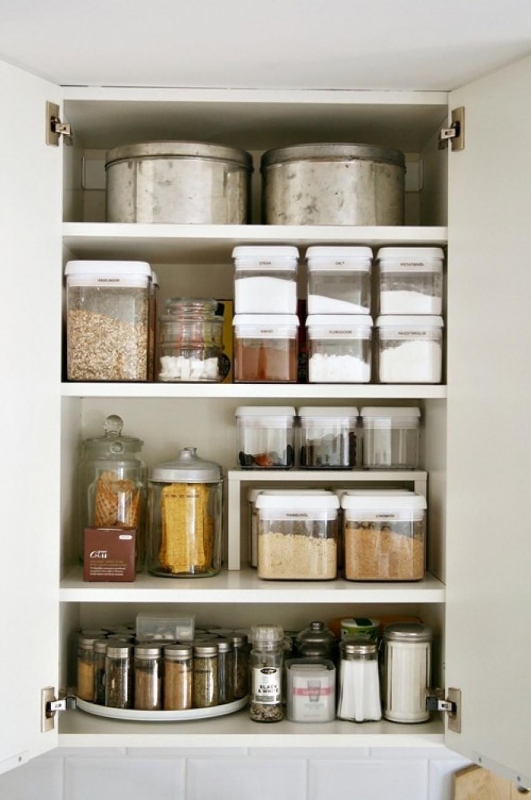 Храните крупы в банках с подписями и желательно в один ряд, чтобы не рыться в поисках нужного. Если вы любитель специй и в вашем доме их предостаточно, используйте вращающуюся подставку для таких баночек со специями.