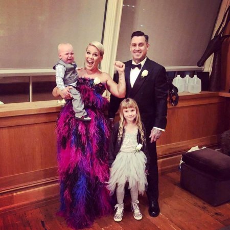 Стоя в кругу близких людей, Пинк позировала в бесформенном пушистом платье сине-розового цвета, которое скрыло фигуру. Однако, по мнению поклонников, несмотря на спорный туалет, певица выглядела чудесно и очаровала всех своим сияющим видом.