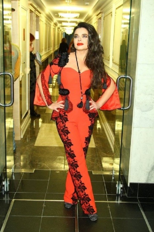 Заслуженная артистка России выбрала для выхода в свет эффектный комбинезон кораллового цвета, щедро украшенный черным кружевом. Облегающий наряд 44-летней красавицы выделял ее на фоне других образов знаменитых гостей, привлекая повышенное внимание публики к ее фигуре и макияжу.