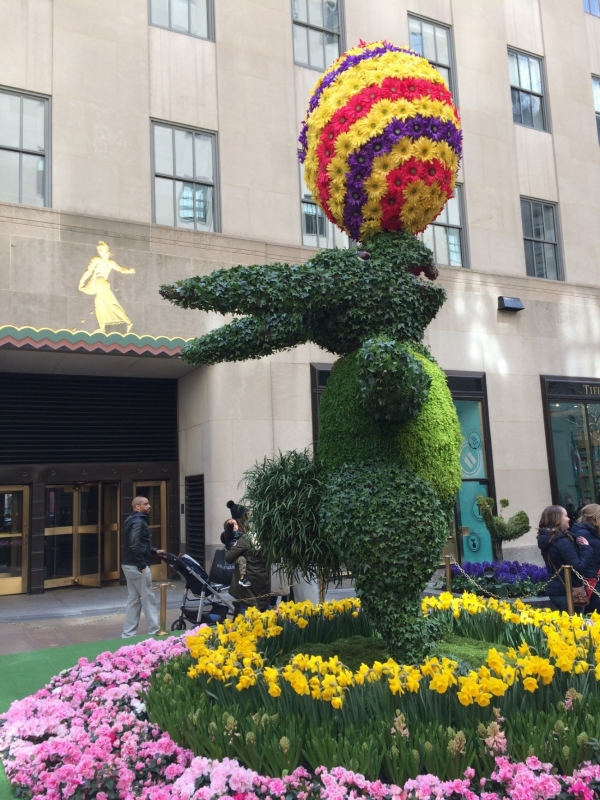 В наш приезд ёлку сменили пасхальные яйца из живых цветов и крутящийся заяц-циркач (или футболист?).