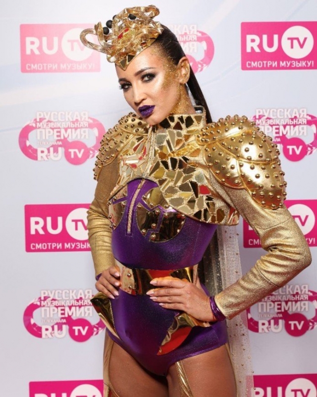 Для того чтобы запомниться в череде многочисленных гостей премии, Бузова выбрала наряд в золотых и фиолетовых тонах, дополнив его золотыми же блестками вместо макияжа и неким подобием короны. Особенно нелепо выглядят круглые зеркальные фрагменты на груди певицы.