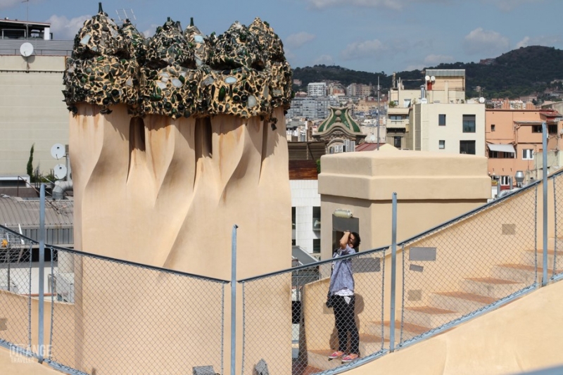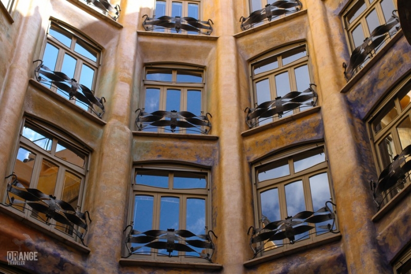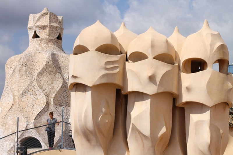 Внутрь Дома Мила попадаешь через патио. Сначала задрав голову, покружившись в отражении окон, рассмотришь макет дома в деталях, затем поднимаешься на крышу. С нее открываются чудесные виды на Барселону.