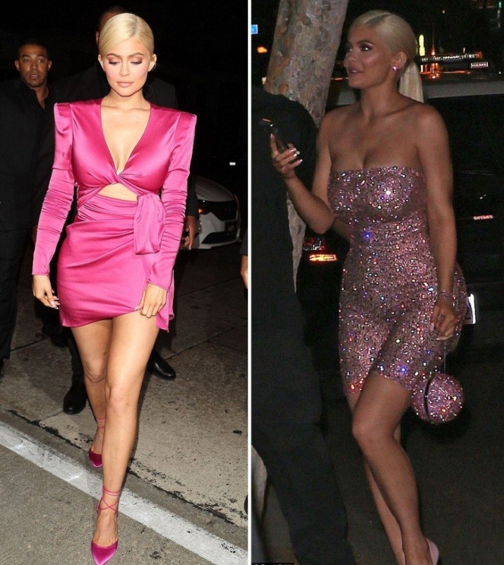 Виновница торжества сменила два наряда за время мероприятия. Сначала она появилась в платье цвета маджента с крупными подплечниками, которые недавно вернулись в моду не только на подиуме, но и в жизни. И без того откровенная верхняя часть наряда была дополнена асимметричной юбкой, открывавшей ноги Кайли. Второй образ девушки также был розовым и не менее откровенным, но на этот раз она выбрала облегающий комбинезон без бретелек, украшенный множеством стразов. Его она дополнила сочетающейся по цвету круглой сумочкой. На вечеринке девушка появилась в качестве блондинки, хотя уже давно предпочитает темный цвет.