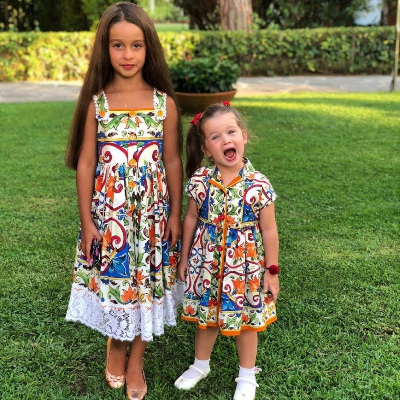 Маленькие модницы, Тея и Маруся, гордо вышагивали в красочных платьях из последней коллекции Dolce & Gabbana, равно как и сопровождающая их Ксения Бородина. Причем Маруся и Ксения были в совершенно одинаковых платьях, в то время как наряд Теоны представлял собой детский аналог, выполненный из той же ткани.