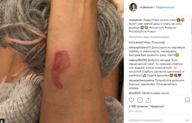Все дело в ожоге, украшающем правую руку актрисы. Фотографией своего временного дефекта Анастасия поделилась с поклонниками в персональном микроблоге, попросив у них совета. «Люди!!!Чем лечить ожог? Болит уже третий день и спать не могу вообще», - написала Макеева.Сильное повреждение кожных покровов говорит само за себя. Очевидно, что Анастасия в самом деле сильно мучается от боли. Многие подписчики настоятельно посоветовали женщине не заниматься самолечением, а обратиться за помощью к специалистам. Но нашлись и те, кто вспомнил пару-тройку народным методов, которые помогают облегчить боль при таких сильных ожогах.