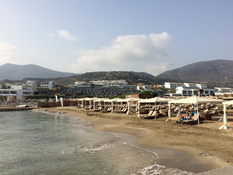 Отель спускается с холма ступенями и каждый номер спрятан от посторонних глаз. Серая облицовка из местного критского камня вся неровная, в "бликах", как на поверхности моря — думаешь, что так и было, а выясняется, что над ней трудилось 150 каменщиков.