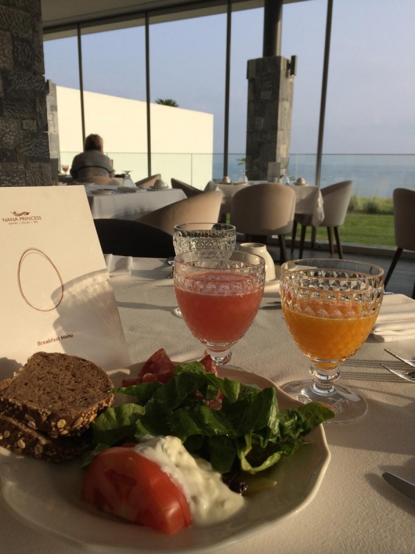Ну, и, конечно, отдых в Греции не обходится без вкусной еды. К завтраку в ресторане отеля Nana Princess подают свежевыжатый сок, какой можно выпить, только сидя по апельсиновым деревом — такой не сделать из апельсинов-страдальцев, добравшихся до Москвы из тёплых стран.