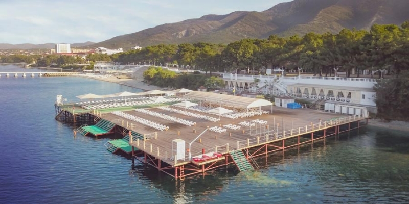 Пляж. Собственный пляж отеля представляет из себя понтон из натурального дерева, который на несколько метров врезается в море. Для купания оборудован специальный спуск, удобный и безопасный. Такого нет ни у одного отеля не только в Геленджике, но и на черноморском побережье. Мы на собственном опыте убедились, как удобно деревянное покрытие по сравнению с песком или галькой — ничто не жжет, не колется и не пачкает. На пляже есть все необходимое для того, чтобы проводить здесь дни напролет: лежаки с навесами, кафе с едой и напитками, душевые и туалеты. Все новое, чистое, удобное. Вход на пляж — только по браслетам гостей отеля, посторонних здесь нет.