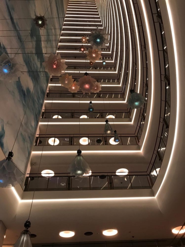 В сквозном атриуме лобби — подвесная инсталляция: все, кто входит в отель, замирают, глядя как бесшумно распускаются и снова закрываются пушистые цветы (или зонтики?).