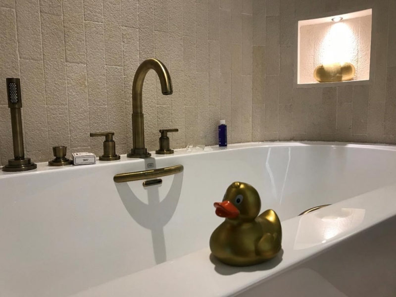 Весь дизайн Jumeirah Beach Hotel вдохновлен близостью моря, песка и парусников — получилось теплое и уютное пространство природных цветов: в белых, бежевых и синих тонах. И маленькая золотая уточка в ванной — ждёт, когда придется время купаться в пушистой пене.