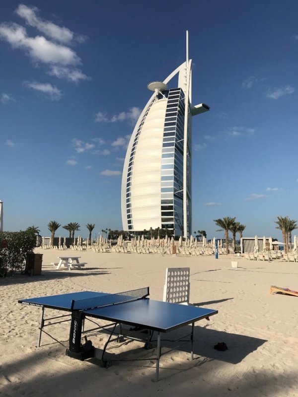 У моря можно не только со удовольствием полежать и поесть, заказав тут же, в пляжном баре, обед и коктейли, но и поиграть в дженгу, настольный теннис — и, конечно, искупаться прямо под "Парусом".