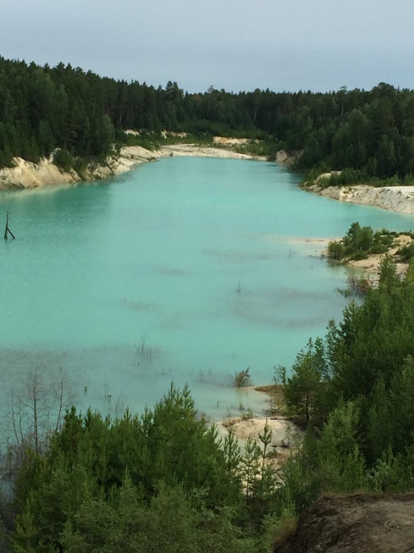 Каолиновый карьер назвали "Уральское Бали" из-за цвета. Раньше здесь добывали глину, но потом карьер затопило, и его забросили, а сейчас он стал интересным местом для посещения туристов. Озеро очень красивое: бирюзового цвета, отсюда и название "Бали". Но берега очень сыпучие, и мы не стали близко подходить.