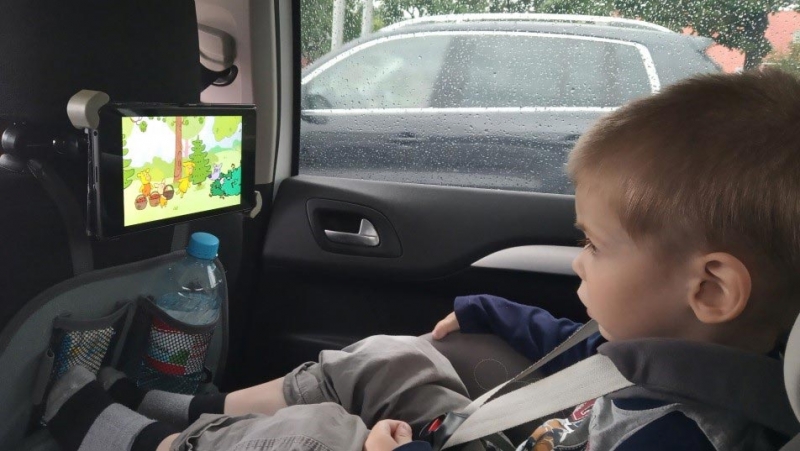возьмите планшет с мультиками, даже если вы против такого времяпровождения. Возможно, он пригодится в пробке, или когда на улице дождь, или нет возможности остановиться и погулять. Мы купили держатель, который вешается на переднее кресло.
