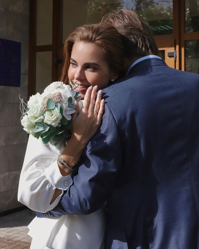 Instagram.com Дарья Клюкина обрела популярность после участия в шоу «Холостяк». Скромная и милая девушка покорила сердце актера Ильи Глинникова, но покинула проект, сообщив, что ответных чувств не испытывает. Спустя год Дарья снова появилась на шоу и на этот раз выиграла: именно ей подарил кольцо Егор Крид. Впрочем, отношения у молодых людей не сложились.В 2018 году Дарья сообщила, что собирается выйти замуж и даже опубликовала видео сделанного предложения. Избранником модели стал Владимир Чопов, который старше девушки на 15 лет. Влюбившись в Дарью с первого взгляда, он попросил ее руки уже спустя 4 месяца отношений. Instagram.com 19 сентября влюбленные стали мужем и женой в Тушинском загсе Москвы. Дарья приехала на церемонию в стильном, но скромном белом брючном костюме, праздничной деталью наряда стали короткие кружевные перчатки. Их модель сняла, когда Владимир надел на палец молодой жене обручальное кольцо. Украшение из золота дополнено уникальным голубым бриллиантом и было изготовлено специально для Дарьи.Несмотря на то что для модели это первый брак, на свадьбе присутствовали только родители и пара друзей новобрачных. Пышный праздник Дарья и Владимир планируют устроить в Италии, Даша в микроблоге признавалась, что для второй церемонии уже купила роскошное платье. Instagram.com