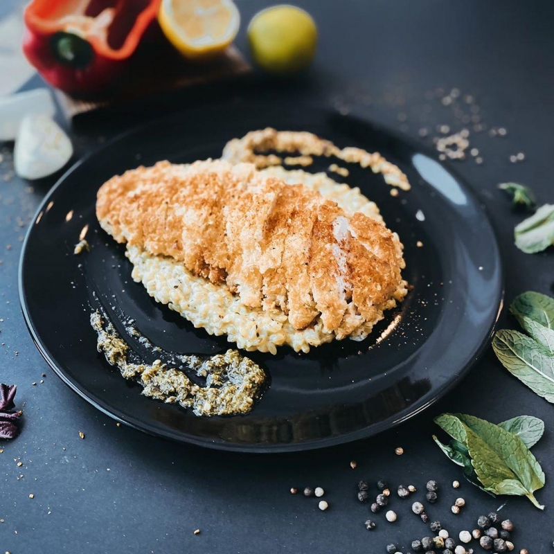 Куриное филе. Автор фото и рецепта: instagram.com/moms_week/ Ингредиенты: Для шницеля:Куриное филе 1шт;Яйцо 1шт;Мука 200 г;Вода 50-70 г;Соль, перец по вкусу;Сухари панировочные;Кунжут 5 г?Для гарнира:Булгур 80 г;Лук репчатый 50 г;Чеснок 1 зубчик;Вода 160 г;Сливки 50 г;Сливочное масло 30 г;Песто 30 г;Сыр 10-20 г;Соль, перец по вкусу Куриное филе. Автор фото и рецепта: instagram.com/moms_week/ Способ приготовления: 1. Куриное филе маринуем в соли и перце, по желанию можно отбить.?2. Готовим кляр. Смешиваем яйцо, муку, воду, соль, кунжут.?3. Обмакиваем филе в кляр, потом в сухари панировочные и жарим на хорошо раскаленной сковороде с двух сторон.4. Лук, чеснок режем мелким кубиком и пассеруем на сливочном и растительном маслах до золотистого цвета.?5. Добавляем и обжариваем булгур также до золотистости. Вливаем воду и варим булгур до испарения воды до 1/3.?6. Теперь добавляем сливки, сливочное масло, пармезан и соус песто. Доводим до вкуса. Приятного аппетита!