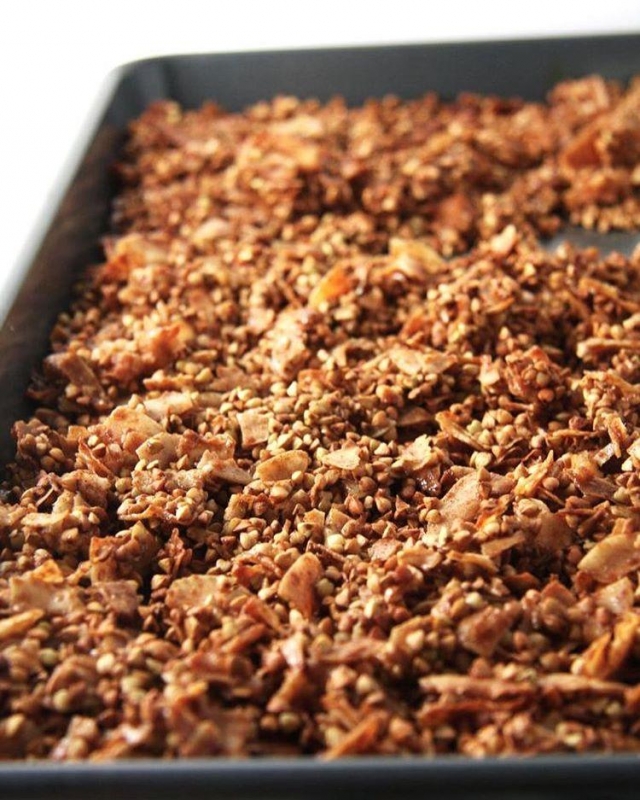 Ингредиенты:? Стакан гречки? Стакан овсяных хлопьев (можно и без них, тогда просто 2 стакана гречки)? Стакан кокосовой стружки? 2 ч. л. корицы? 1/2 ч. л. соли? 3 ст. л. растаявшего кокосового масла? 2 ст. л. кокосового сахара (можно заменить кленовым сиропом или стевией)? Ванильный экстракт или ванилин?Совет: можно добавить мед, финики, орехи, кунжут, семечки подсолнечника или тыквенные, цукаты.
