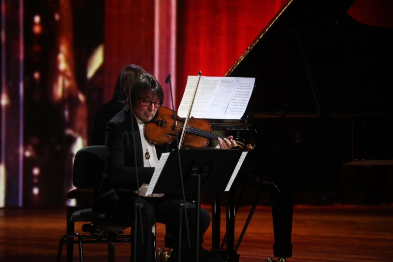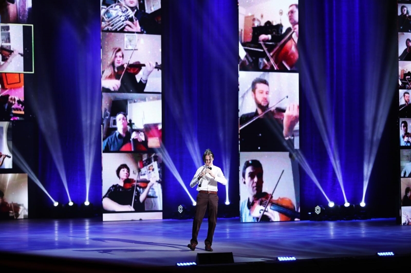 Не стало помехой и то, что Денис Мацуев сейчас находится в родном Иркутске. Пианист вышел на связь и сыграл для всей страны несколько произведений, среди которых детская песенка «Нам не страшен серый волк». Под аккомпанемент Мацуева Евгений Миронов исполнил песню «Журавль по небу летит» вместе со скрипачом Вадимом Репиным.