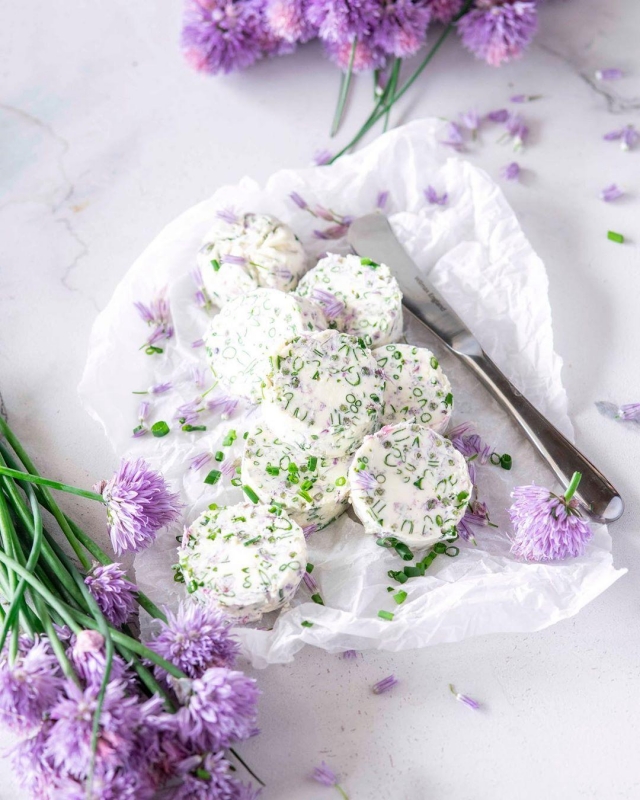 Ингредиенты:• сливочное масло• шнитт-лук• соцветия шнитт-лука• чеснок по вкусу• соль по вкусуСовет: экспериментируйте с вкусами, можно использовать любую свежую зелень — петрушка, укроп, также гранулированный чеснок вместо свежего, горчицу, копченую паприку, карри и так далее.