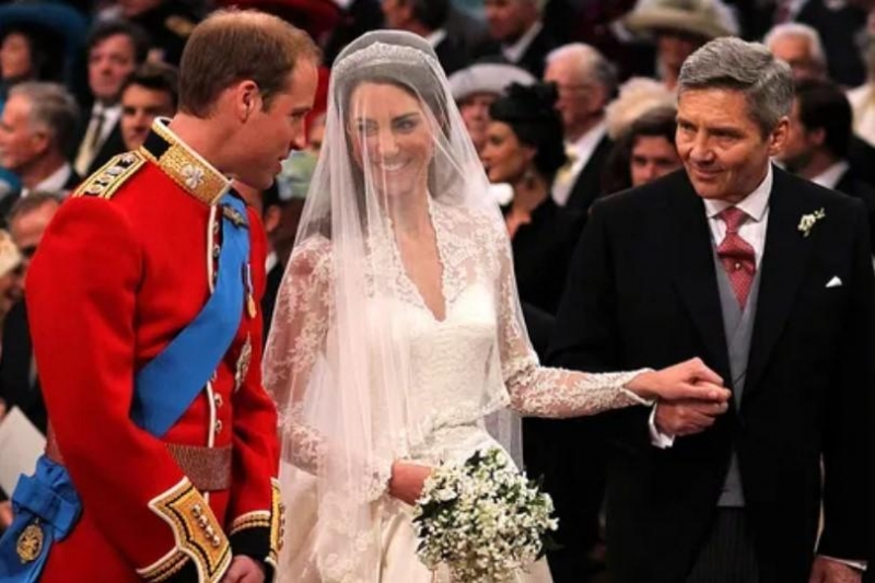 В церковь Кейт входила в сопровождении отца, который должен был передать невесту в руки взволнованного жениха. Уильям, увидев будущую герцогиню, прошептал, что она прекрасна и выглядит очаровательно, а затем обратился к ее отцу, решив немного разрядить обстановку.