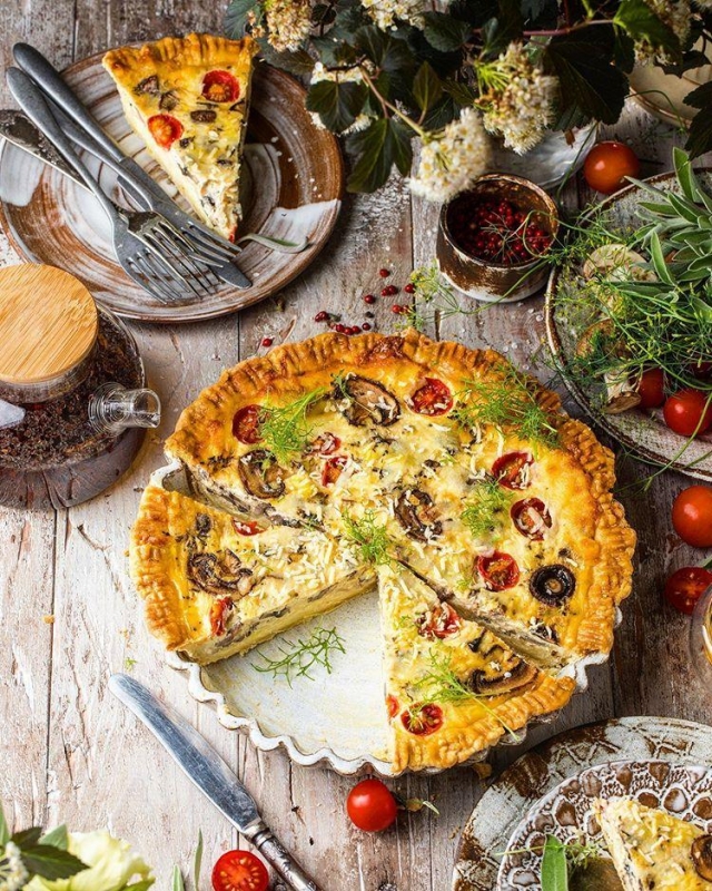 Автор фото и рецепта Дарья Близнюк: instagram.com/zhabcka/ Ингредиенты:Тесто: масло сливочное (холодное порезать кубиками) 130 гсоль щепоткаяйцо 1 шт СО (60 г)мука 200 г Начинка: сыр сулугуни 300 ггрибы шампиньоны 200 глук 70 гкуркума 2 гяйца 3 шт (180 г)молоко 100 млсливки 33-35% 250 млпомидоры черри 100 гсоль и перец по желанию (если сыр не пресный, то соль не нужна совсем)прованские травы 1 ст.л. Процесс приготовления:1. Муку и соль смешать, добавить масло, быстро растереть в крошку, добавить яйцо и вымесить тесто. Сформировать шар, убрать в пленку и в холодильник на 30 минут.2. Форму смазать маслом, хорошо присыпать мукой.3. Тесто раскатать в круг, выложить в форму, сформировать бортики. Можно сделать бортик вилкой или руками, просто обрезать лишнее или сплести косичку. Сделать наколы вилкой на дне, положить пергамент, высыпать килограмм фасоли. Выпекать в разогретой до 180С духовке минут 15, убрать фасоль и пергамент и еще минут 10 выпекать.4. Грибы и лук порезать и обжарить в ложке оливкового масла до готовности. 5. Соединить в миске яйца, молоко, сливки, куркуму. Сыр натереть на крупной терке. Выложить почти весь сыр в форму, вылить сливочную заливку, положить половинки помидоров черри, красивые грибочки, посыпать перцем и травами.6. Бортик смазать желтком. Вернуть пирог в духовку минут на 25, до золотистого цвета.7. Достать из духовки, нарезать. Можно есть горячим и холодным.