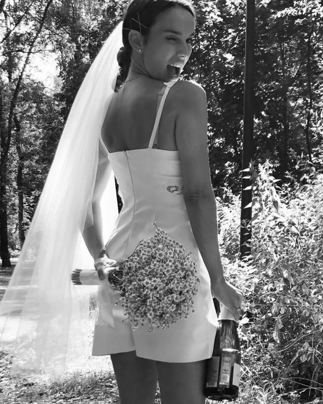 В социальной сети Юлия опубликовала фото, на котором позирует в свадебном платье и фате. В качестве наряда для церемонии актриса выбрала короткий белый сарафан, открывающий плечи и длинные ноги. На снимке Юлия кокетливо подмигивает фотографу, держа в руках букет ромашек и бутылку шампанского.