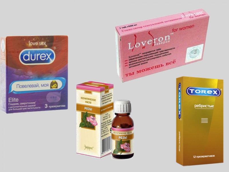 Сверхтонкие презервативы, DurexМасло розыРебристые презервативы, TorexТаблетки для увеличения сексуальной активности у женщин, Loveron
