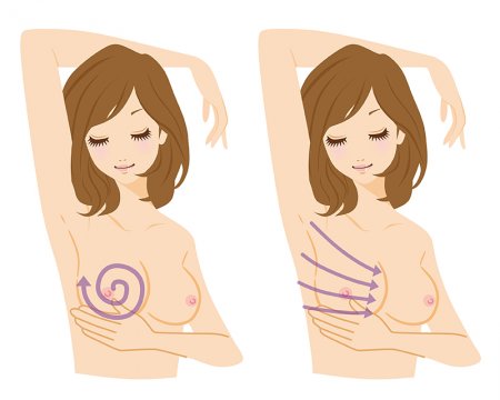 Наконец, провести пальпацию: сомкнуть пальцы и подушечками аккуратно прощупать грудь круговыми движениями, слегка надавливая. Правую молочную железу — левой рукой, левую — правой рукой.