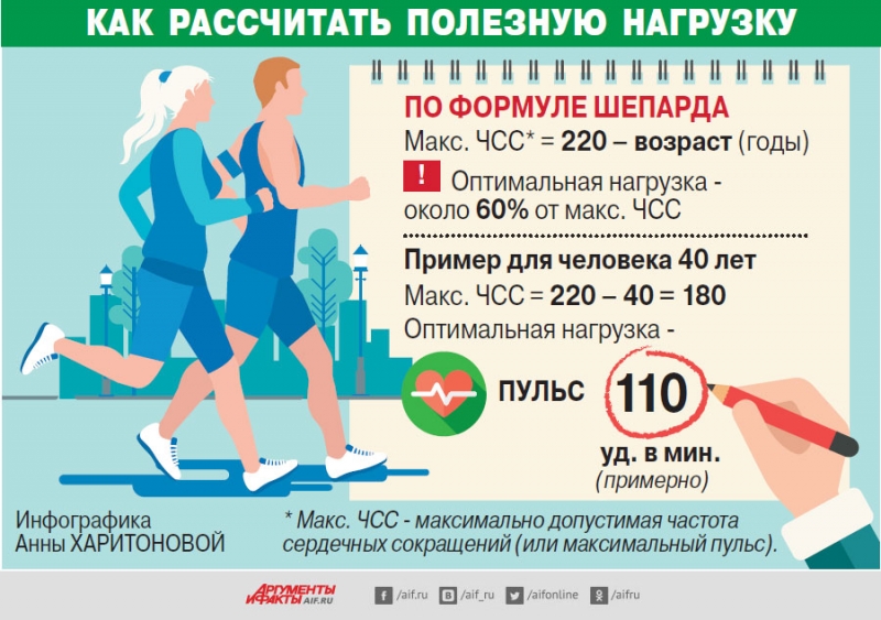Главное — ориентироваться не на километры дистанции, а на состояние организма. Это можно определить по пульсу, рассчитывая оптимальную нагрузку по очень простой формуле Шепарда (см. инфографику). С её помощью вы определите максимально допустимую частоту сердечных сокращений во время нагрузки для вашего возраста. Хорошо, если во время занятий пульс у вас будет составлять 50-60% от максимального. Обычно это соответствует ощущению лёгкой испарины. Старайтесь придерживаться такой нагрузки».