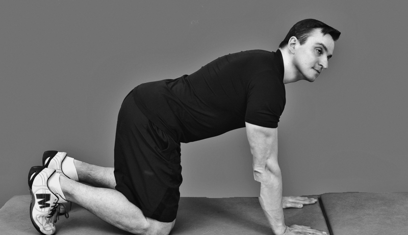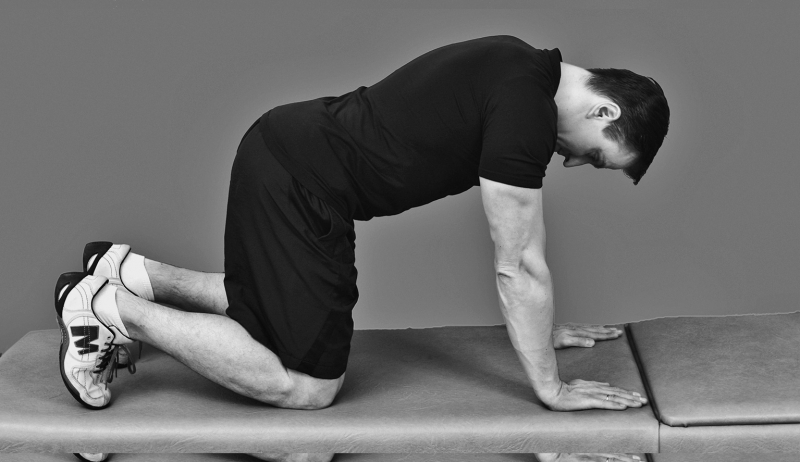 Упражнение способствует укреплению мышц задней и боковой групп шеи, мышц шейно-затылочной области. Выполняется в 2 фазы. Исходное положение — стоя на четвереньках.