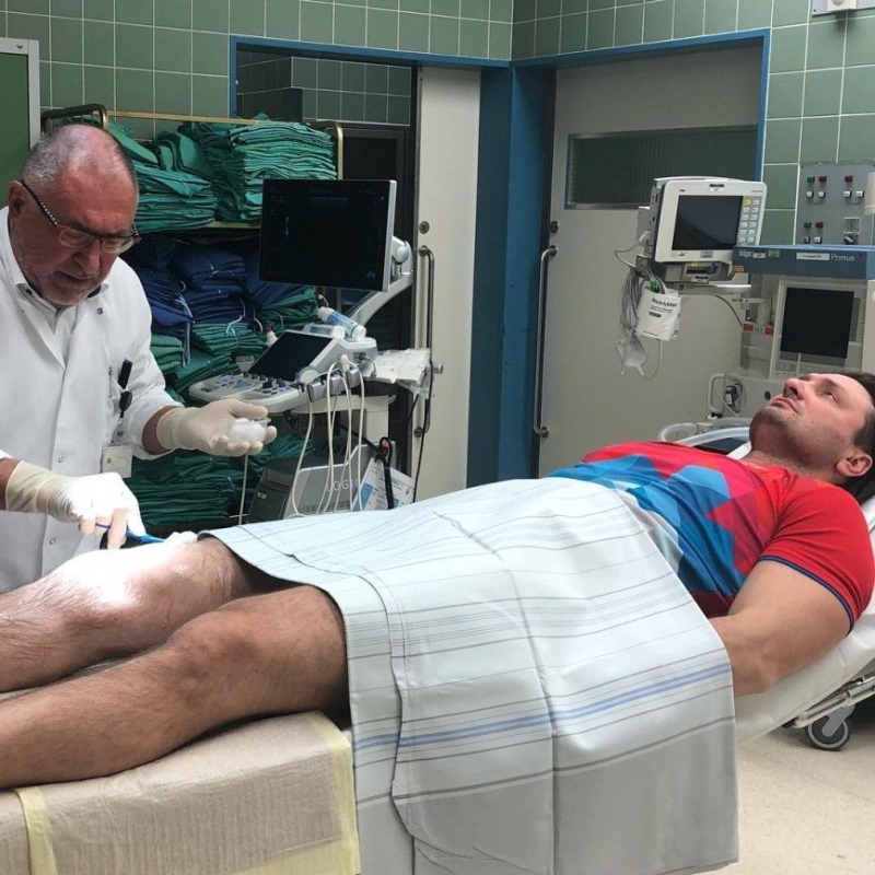 «И снова я на техосмотре в Германии! Русские врачи поставили мне диагноз - «Полный разрыв передней крестообразной связки колена»! Небольшую операцию решили провести после новогодних шоу в Лужниках! А в перспективе через 10-15 лет мне придется заменить коленный сустав на искусственный».