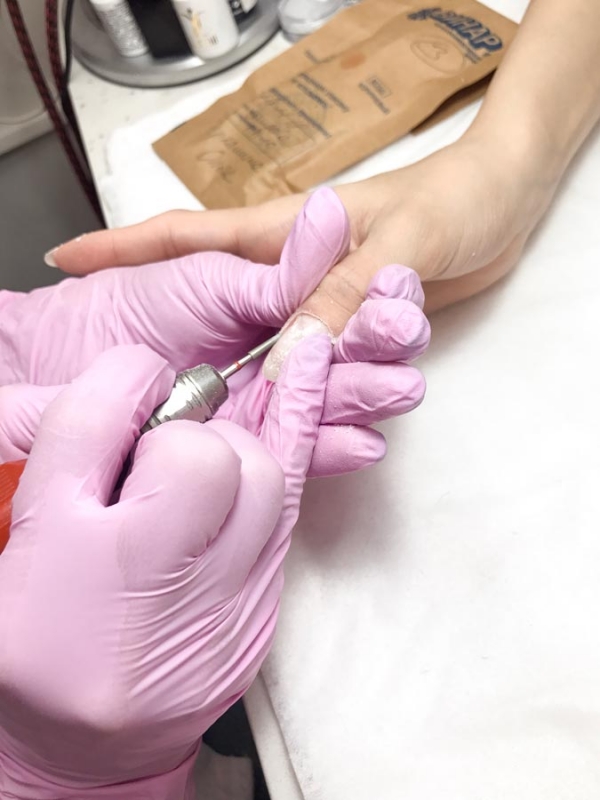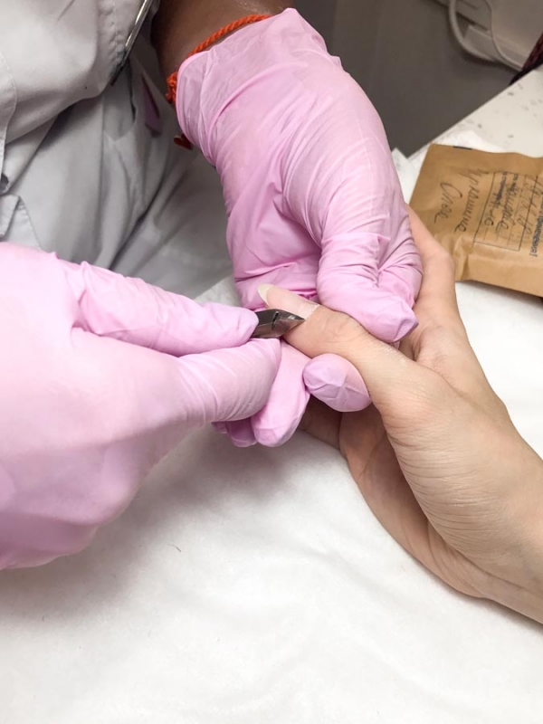 - Откорректировав форму ногтей, приступаем к удалению кутикулы, применяя аппарат для маникюра. А то, что не смогли снять аппаратом — снимаем кусачками. Это комбинированный способ корректировки ногтевой пластины — аппаратно-обрезной. Сначала кутикула приподнимается аппаратом, а затем кусачками удаляют то, что приподняли.