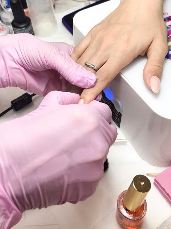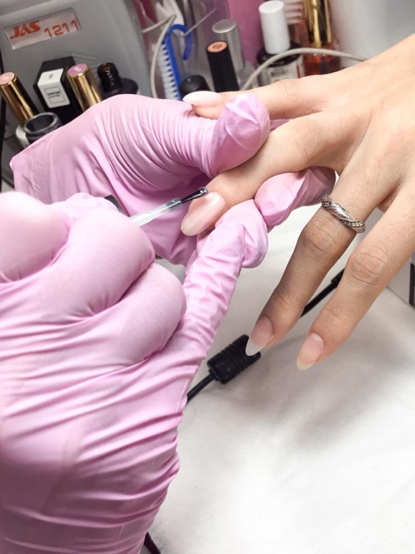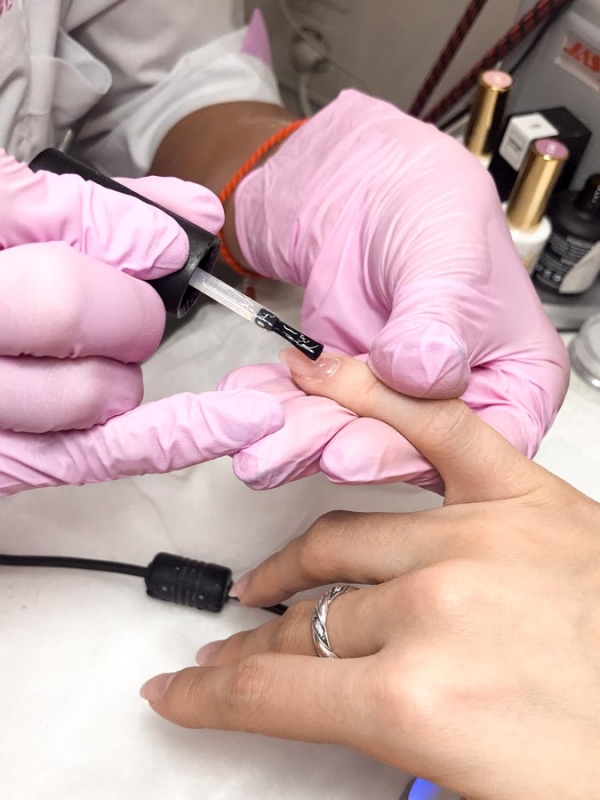 - После того как обработали обе руки, приступаем к нанесению базового слоя. После нанесения базы и сушки ее под УФ-лампой наносим тон. Также база уже сама по себе может быть нюдового оттенка, что значительно упрощает процесс маникюра.