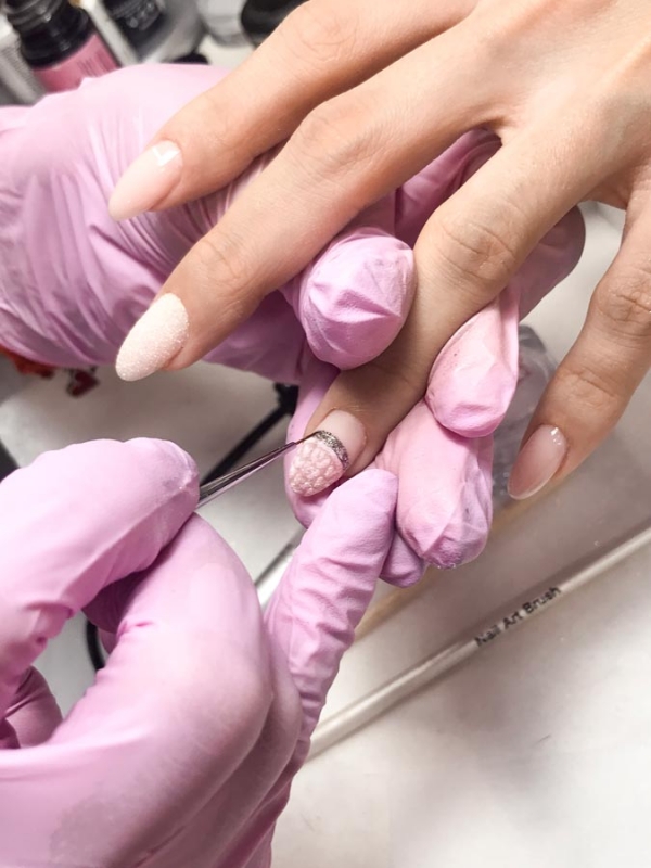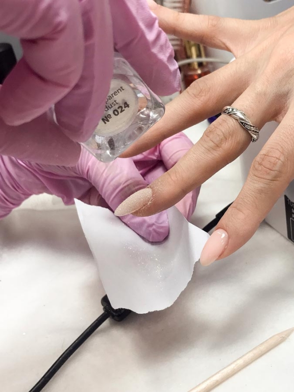 Теперь займемся дизайном маникюра. На ноготь безымянного пальца наносим сначала тоновое покрытие, затем верхнюю половину ногтя посыпаем пудрой, кисточкой создаем орнамент, а ниже наносим глиттером блестящую линию. На ногти, которые не тронуты посыпкой, наносим последний топовый слой и сушим все пальцы в УФ-лампе. Финальный штрих — наносим масло для ногтей и кутикулы. Если топовое покрытие было с липким слоем, необходимо после сушки удалить липкий слой обезжиривателем. Если топ без липкого слоя, то после сушки можно сразу приступать к увлажнению кутикулы маслом. Партнерский материал