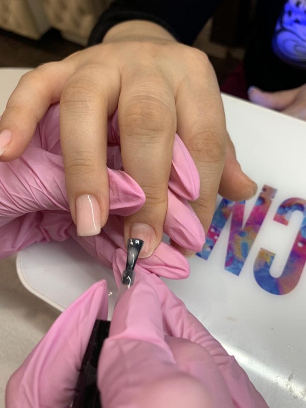 4. Наносим базовый лак для ногтей. В нашем случае использовалась каучуковая база. Она телесного цвета и ложится намного плотнее обычной. С ней дополнительное укрепление ногтя не требуется. Рекомендуется накладывать в два слоя. Каждый слой сушим в УФ-лампе.