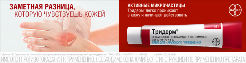 В борьбе с нейродермитом очень важно устранить инфекцию и облегчить течение болезни, вовремя купируя ее симптомы, снимая зуд и раздражение кожи. Часто это помогает добиться долговременной ремиссии и даже полностью избавиться от заболевания. Здесь на сцене появляется Тридерм – современный оригинальный препарат с тройным действием: противовоспалительным, антибактериальным и противогрибковым. Комплексный состав способствует облегчению зуда и высыпаний, а также борется с инфекцией, не допуская перехода болезни в более тяжелую стадию.Многим людям, страдающим от нейродермита, название препарата Тридерм давно знакомо. И все же, несмотря на то что его можно купить без рецепта, при появлении тревожных симптомов рекомендуем вам записаться на прием к врачу-дерматологу.