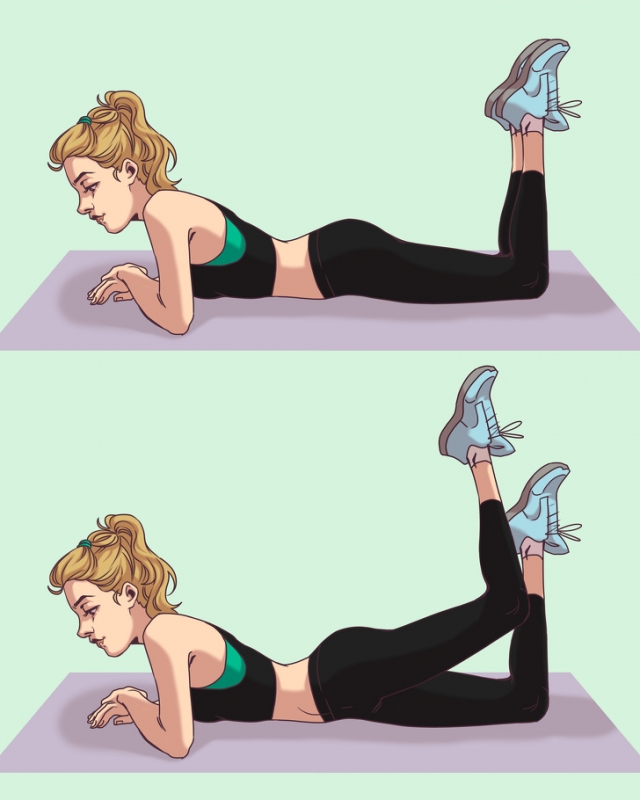 Встаньте на колени и обопритесь на локти, одну ногу поднимите вверх до параллели с полом.