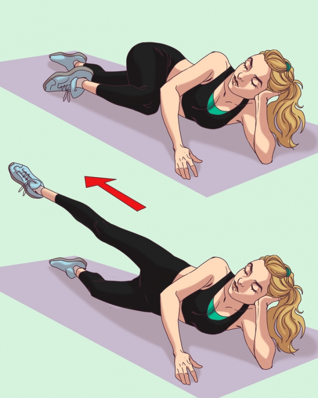 Поднимите одну ногу до максимального положения. Старайтесь, чтобы бедра прижимались к полу. Упражнение нужно делать медленно, стараясь почувствовать мышцы, которые работают.