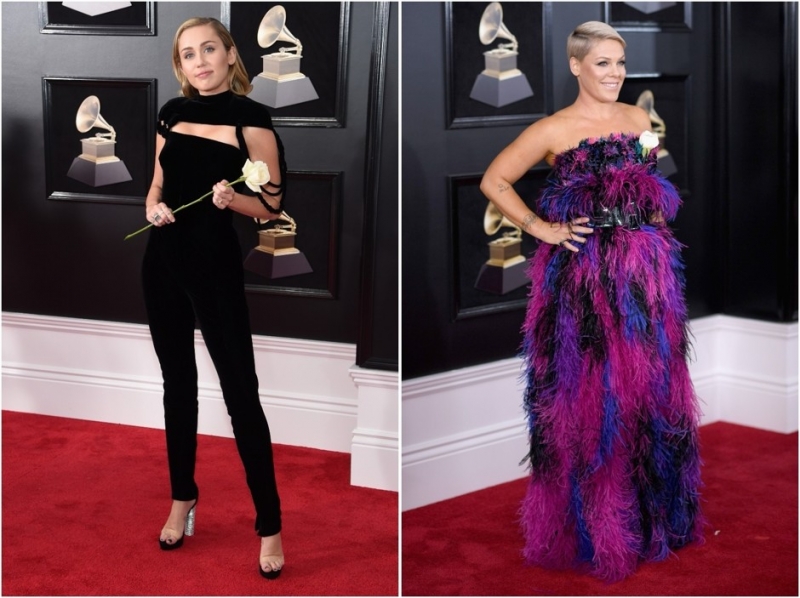 Майли Сайрус, ПинкМногие звезды появились на премии с белыми розами, в знак протеста против сексуальных домогательств и в поддержку женского движения Time's Up. Так, с цветами на красную дорожку вышли Майли Сайрус и Пинк. 25-летняя Майли выбрала для вечера скромный классический костюм от Jean Paul Gaultier, а 38-летняя Пинк надела яркое пышное платье от Armani Prive.